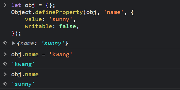 - writable - false 면 값을 수정할 수 없다. (기본값은 true)