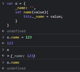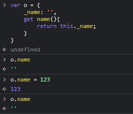 처음엔 obj._name 이란 값이 없으므로 undefined가 출력되다가, 다음 줄에서 'test' 를 name 에 할당해주면
