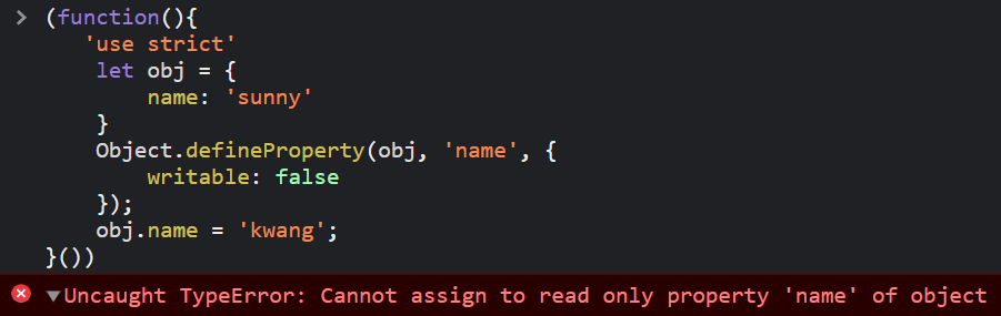 참고로, 위 예시를 엄격모드에서 실행하면 Cannot assign 에러가 발생한다.