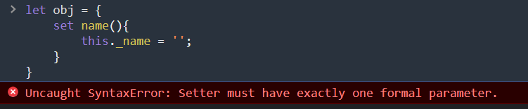 만약 setter에 인자가 하나가 아니면 에러가 발생하고 getter에 인자를 하나라도 받으면 에러가 발생한다.
