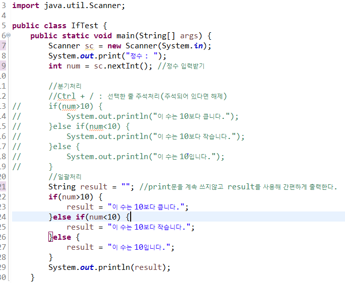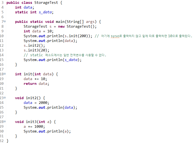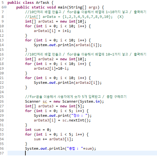# temp (순서바꾸기) int temp = a; a = b; b = temp; 1. temp 라는 빈 공간에 a를 넣어준다. --> int temp = a; 2. a가 빠져나온 곳애 b를 넣어준다. --> a = b; 3. b가 빠져나왔기 때문에 빈공간이 되어버린 그곳이 temp이다. --> b = temp; 컴파일 결과 전 : a = 20, b = 10 후 : a = 10, b = 20 배열의 순서 바꾸기 // 3개의 배열 순서 바꾸기 int []arr = {5, 7, 2}; for(int n:arr) //n에 arr을 담는다. { System.out.println(n); } System.out.println(); System.out.println("0번과 2번을 교환 후 출력"); int temp..