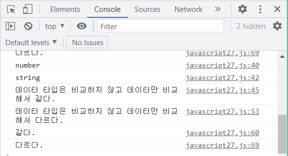 console.log('데이터 타입은 비교하지 않고 데이터만 비교해서 다르다.');